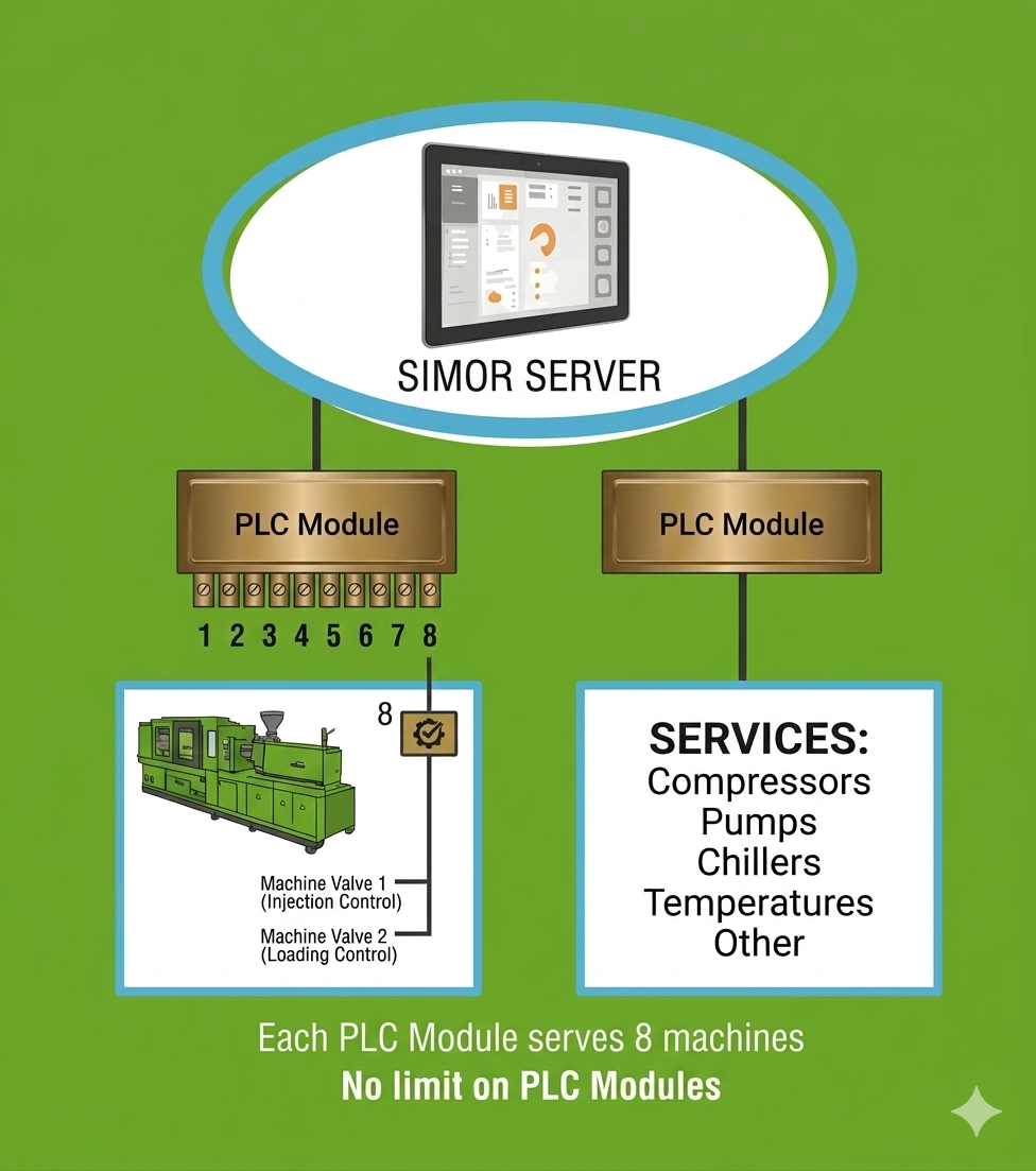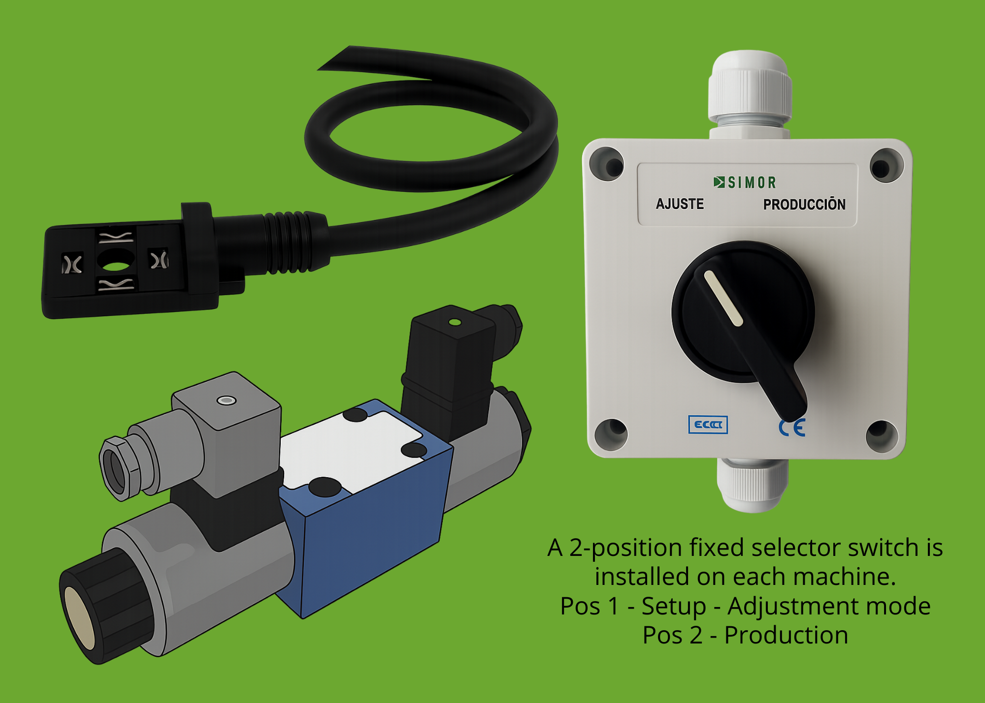 ![]() Instalación del sistema en máquina: -Non invasive installation on the machine´s original control system. -Integration of 2 parallel DIN connectors: valve 1 (injection function) and valve 2 (charging function). -Installation of a position selector switch: Setup/adjustment and production. - Enables differentiation between actual production cycles and adjustment or startup cycles. |